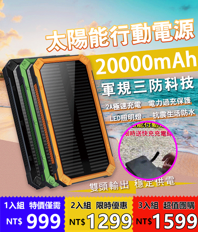 4分鐘前太陽能行動電源 - 【限時下殺】太陽能行動電源2入組僅需-NT$ 1299